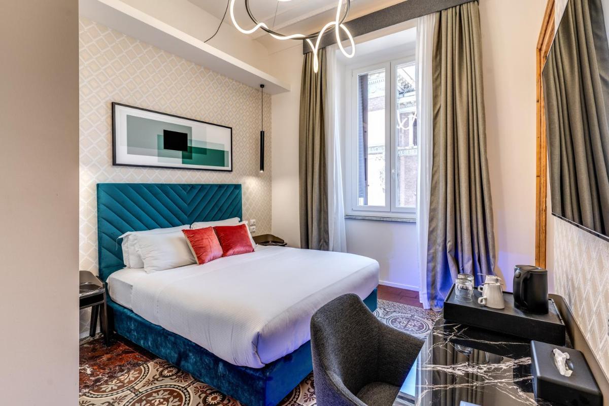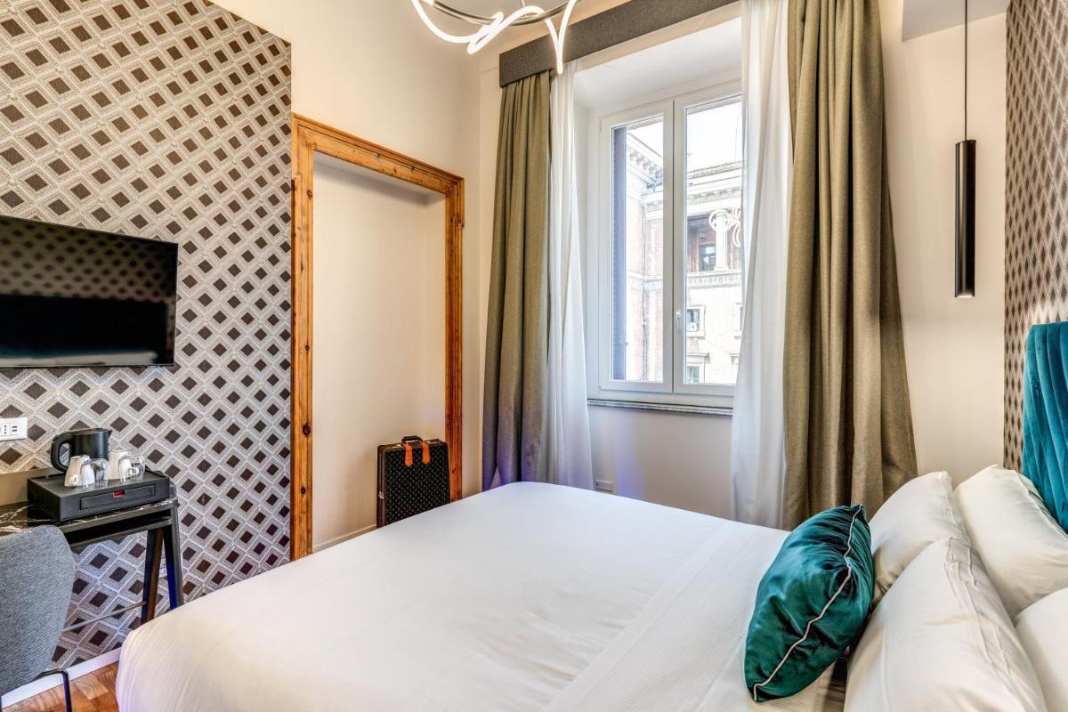 Framed windows look onto lively Roman streets, while the common areas highlight the building’s character with high ceilings and chandeliers. Kitchenette suites display compact, functional setups for longer stays.